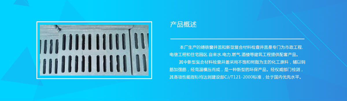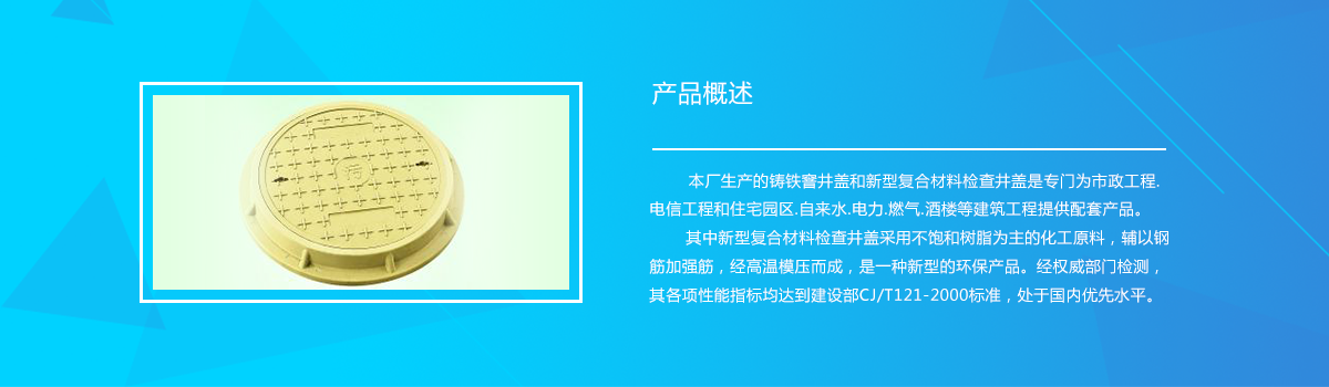 关于我们 长兴中意铸造厂 长兴中意铸造厂始建于1990年,坐落于长兴县经济开发区,占地面积一万多平方米,交通便捷,环境优美。产品主要有各类窨井盖;明沟盖板等。 本厂生产的铸铁窨井盖和新型复合材料检查井盖是专门为市政工程.电信工程和住宅园区.自来水.电力.燃气.酒楼等建筑工程提供配套产品。其中新型复合材料检查井盖采用不饱和树脂为主的化工原料,辅以钢筋加强筋,经高温模压而成,是一种新型的环保产品。经权威部门检测,其各项性能指标均达到建设部CJ/T121-2000标准,处于国内优先水平。本产品具有无回收利用价值,无撞击噪声.耐腐蚀.耐摩擦.耐高低温,并可根据需要调制各种颜色等优点,它不仅从根本上解决了城市陷阱问题,从而提高城市品位,广泛用于供水.排水.通信.天然气.绿化等行业。